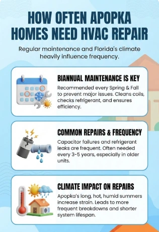 Short answer: Apopka homeowners typically need HVAC repairs 1–2 times per year with proper maintenance. Central Florida's subtropical climate pushes systems harder than almost anywhere else in the country.